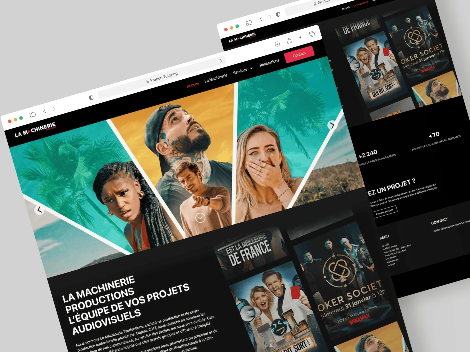 L’objectif de cette refonte était de créer une plateforme numérique sur mesure, capable de mettre en valeur leur expertise en production et post-production, d’offrir une vitrine professionnelle à leurs projets phares, et de consolider leur image de marque auprès de leurs clients partenaires.
